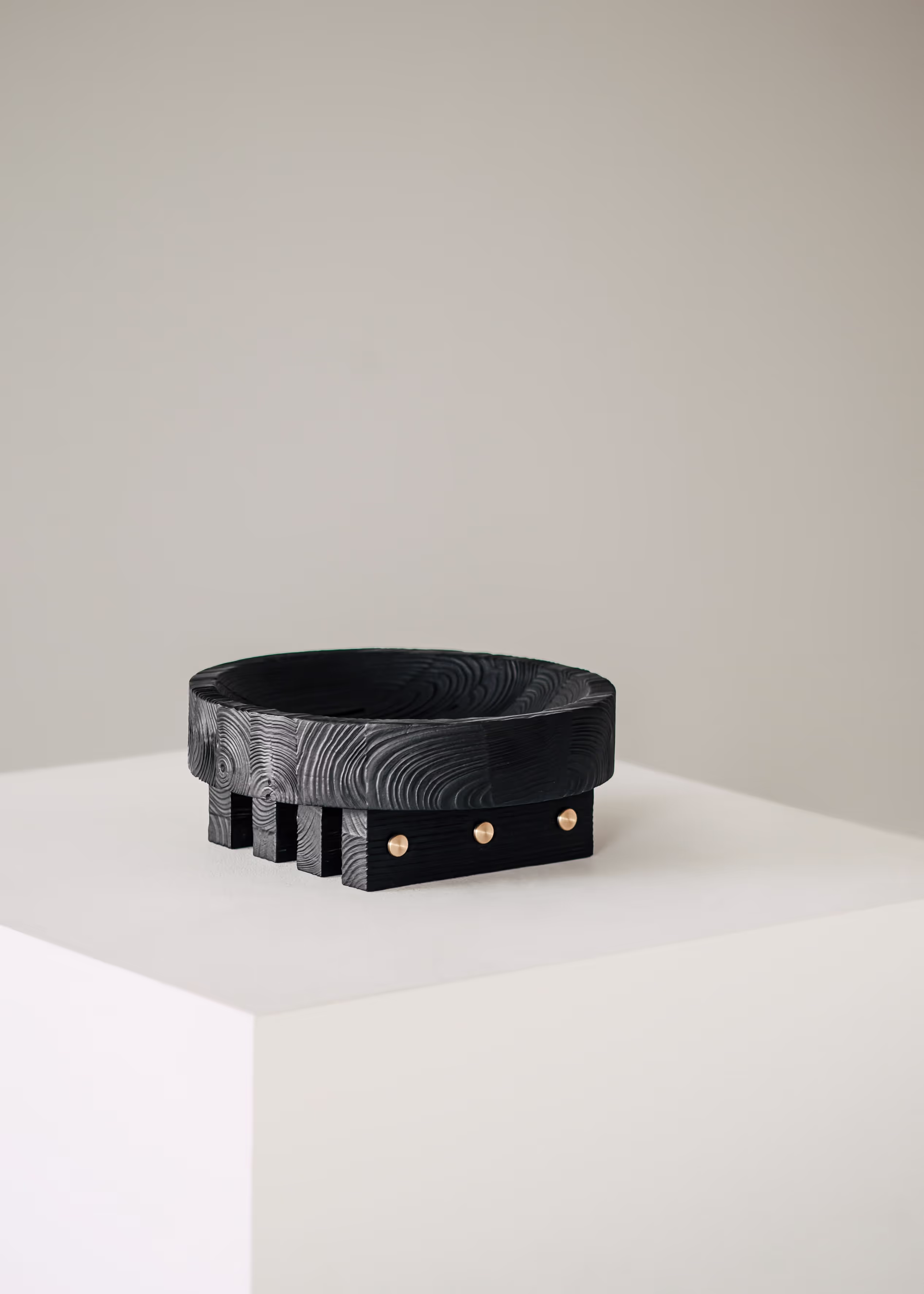 Handcrafted in Portugal from Portuguese pinewood, Atha bowls celebrate the beauty of nature through organic forms and historic techniques. Carved, spun, scorched, and sandblasted, each textured vessel showcases expert craftsmanship. Polished bolts locked through the wood symbolize strength and permanence, highlighting the fusion of material and design.