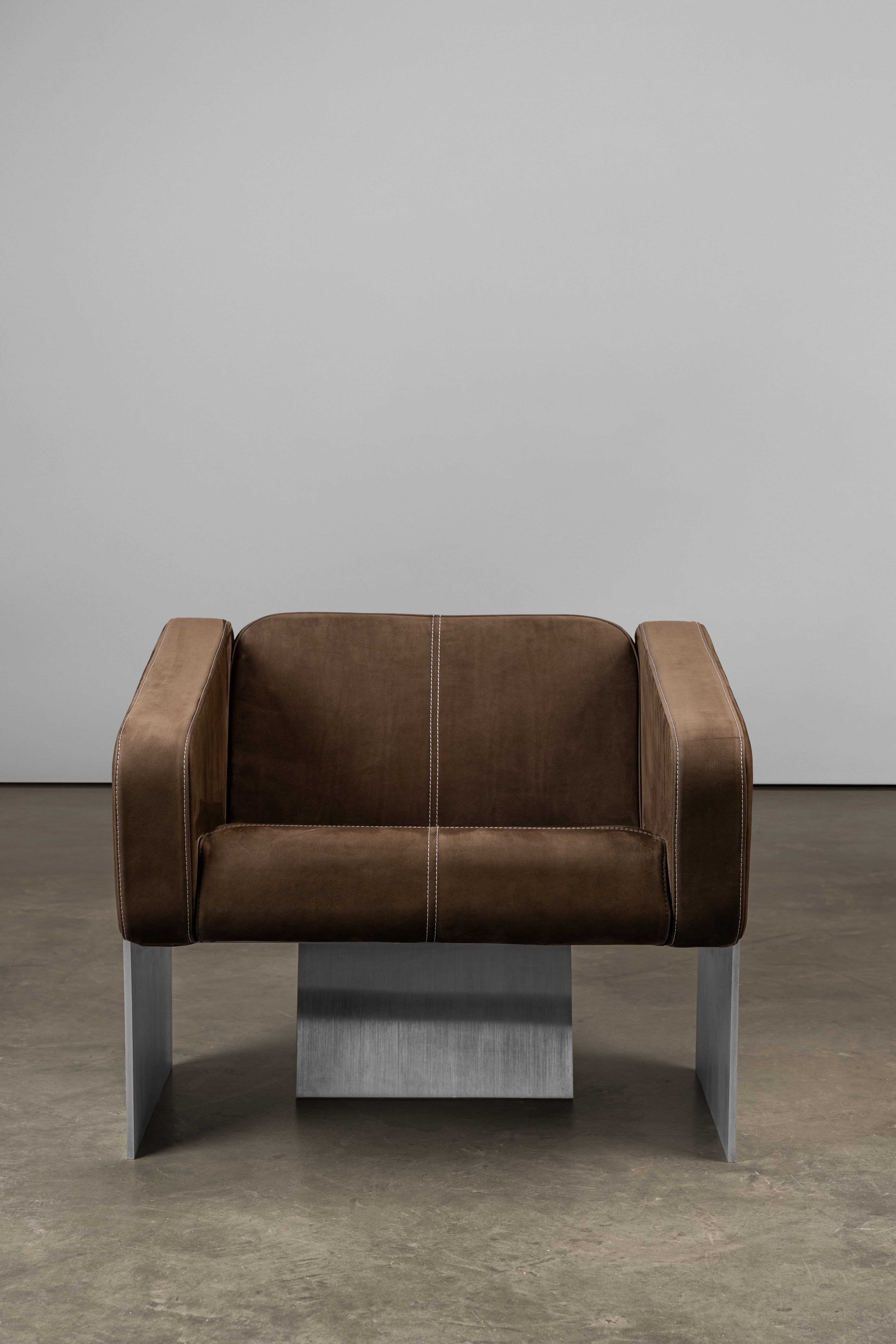 The sofa shown is finished in Brushed Aluminum and upholstered in Nubuck Leather.